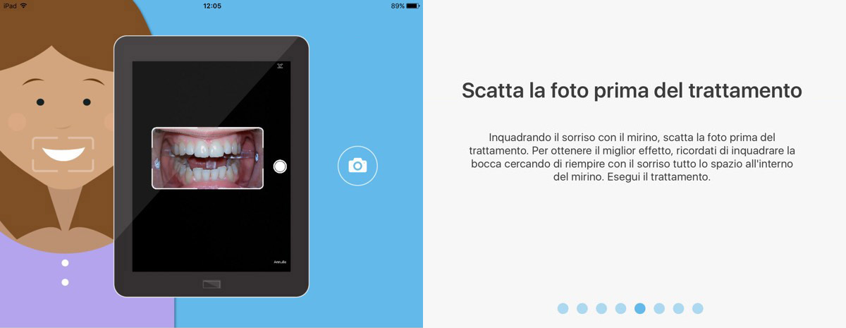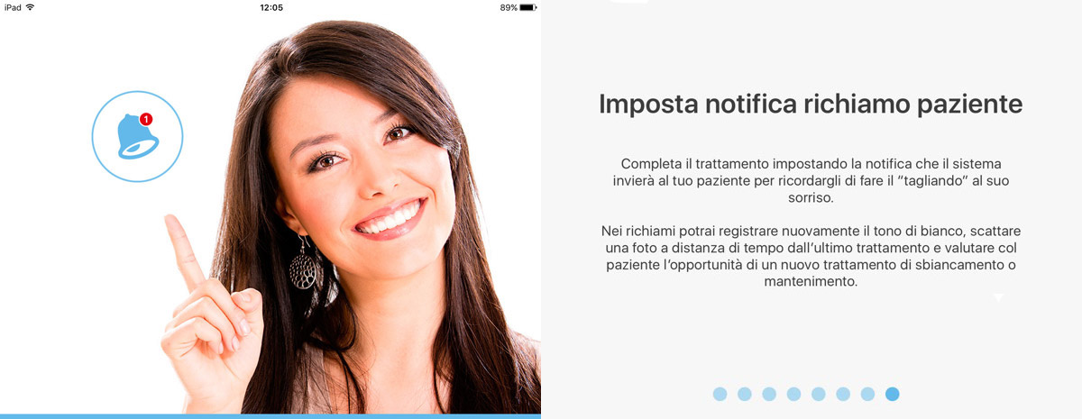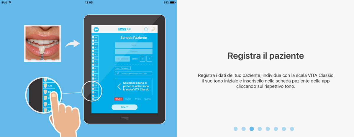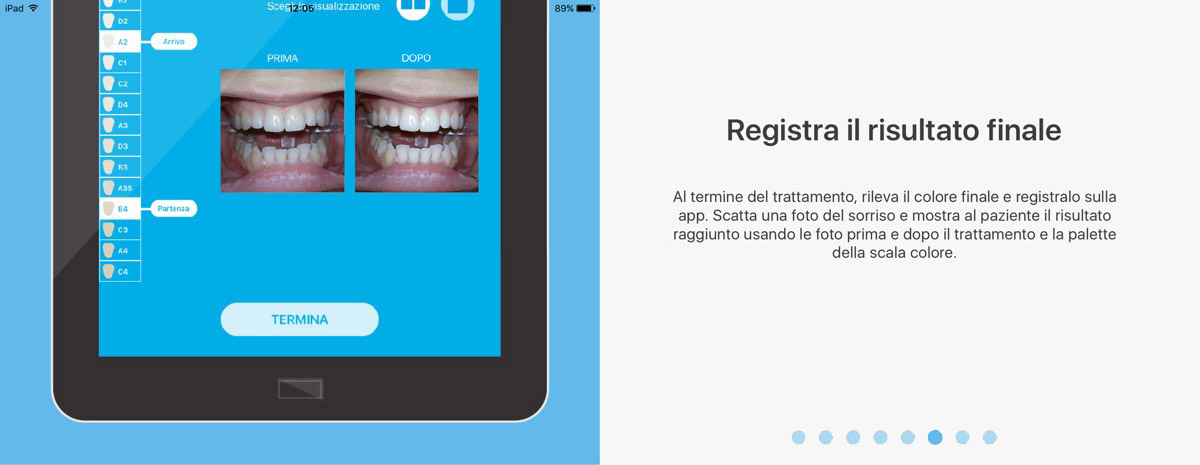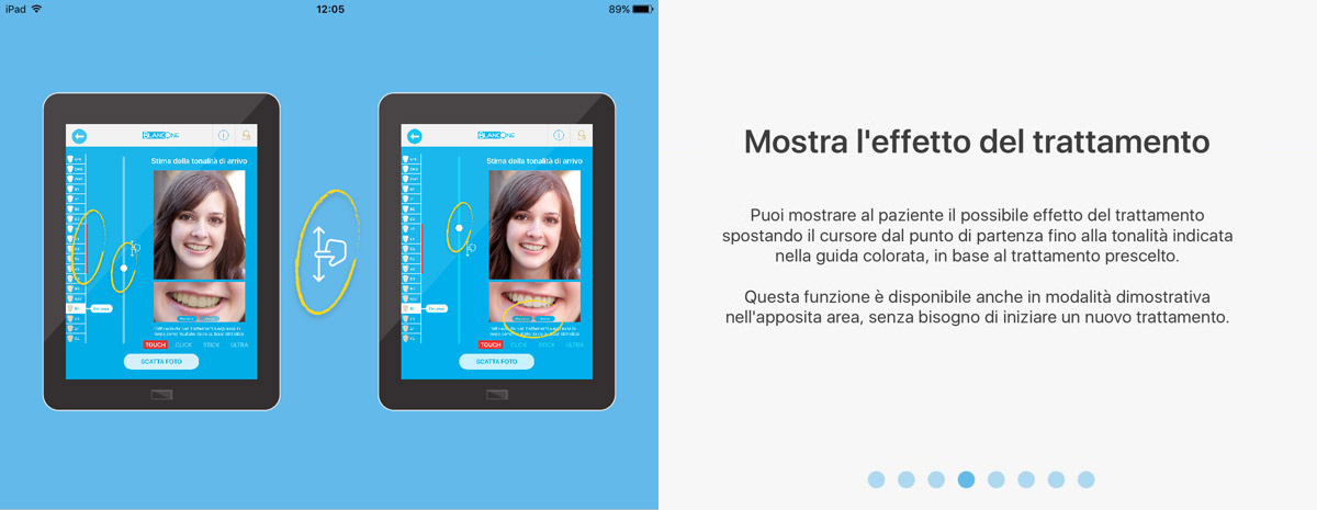 - Attraverso l’area dimostrativa e in base al tipo di trattamento selezionato potrai mostrare, in modo veloce e attrattivo, quanto è possibile migliorare il tono di bianco dei suoi denti.