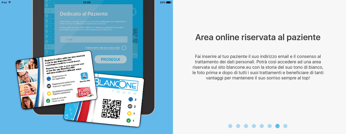 - Ogni paziente avrà una sua area riservata online, dove potrà accedere alle informazioni e alle foto dei suoi trattamenti, esprimere una valutazione e lasciare un commento. In questo modo ogni paziente BlancOne potrà tracciare una storia grafica e fotografica del suo tono di bianco.
