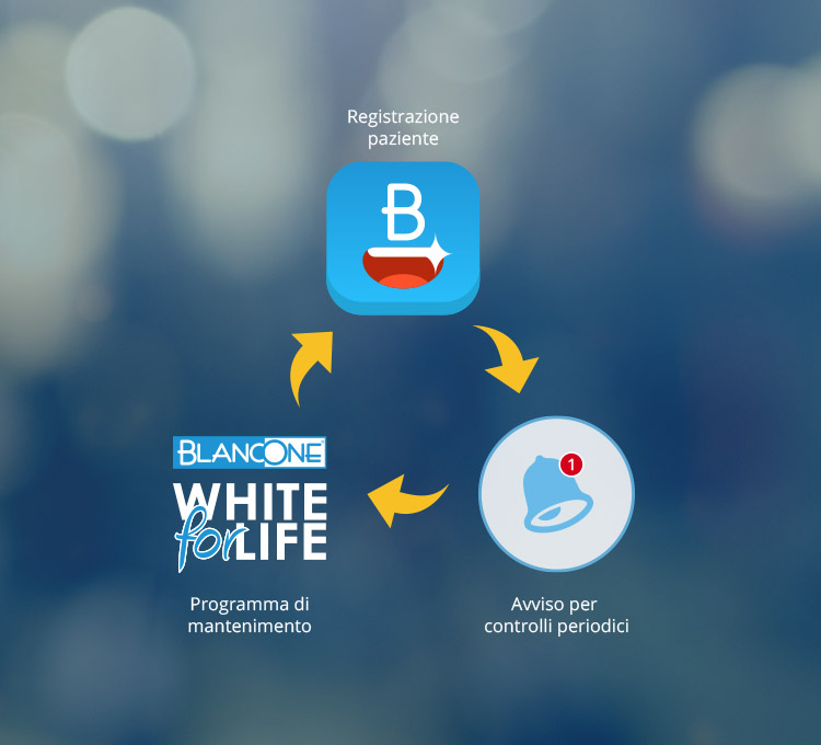 - Alla fine del trattamento potrete abbinare il programma di mantenimento Xtra e, incrociando le informazioni del trattamento con le abitudini del paziente, l’app vi proporrà a che distanza di tempo eseguire una visita di controllo. Ci penserà l’app BlancOne PRO a invitare il paziente alla visita periodica nel vostro Centro, inviando una mail in maniera automatica.