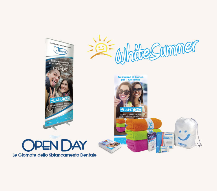 Per dare risalto alla tua attività, celebrare un momento particolare e far conoscere l’innovativa tecnologia dei tuoi sbiancamenti, ti basterà chiamare il tuo consulente BlancOne e organizzare un Open Day! Inoltre durante l’anno potrai scegliere di aderire a particolari promozioni attivate da BlancOne: sempre più pazienti verranno a trovarti nel tuo centro!